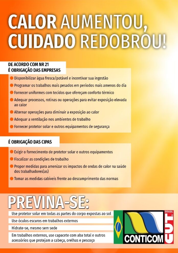 A Meteorologia adverte para um episódio excepcional de calor que vem sendo registrado em grande parte do Brasil. As marcas estão superando em muitos os valores médios históricos de temperatura máxima em todas as cinco regiões do país, razão pela qual, preocupado com o bem estar dos trabalhadores e trabalhadoras, o SITICCAN abraça a Campanha “Calor aumentou, cuidado redobrou”!